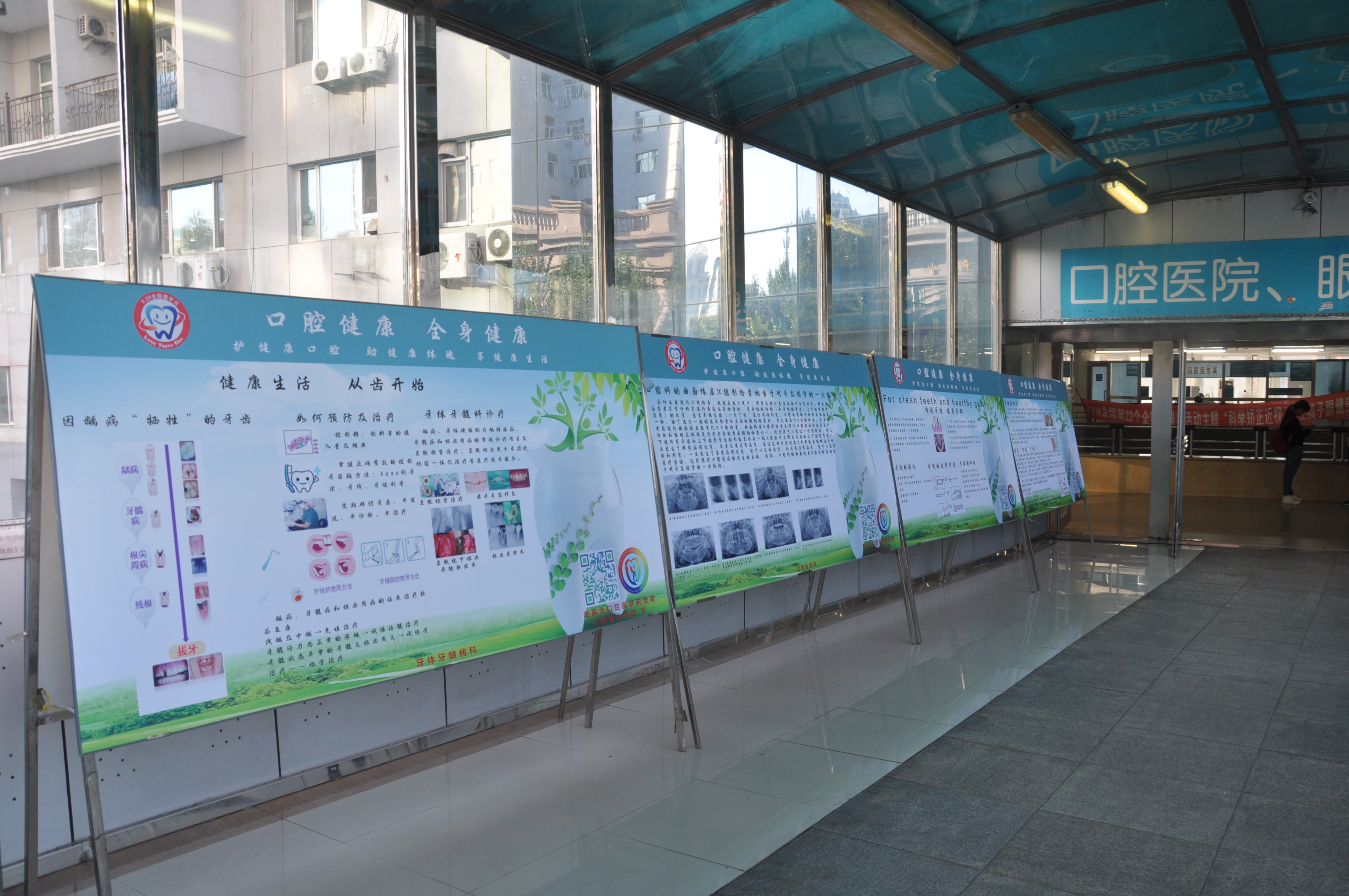 9月19日下午,在口腔医学院二楼天桥上,展出了覆盖口腔所有临床科室的一系列口腔医学科普、保健宣传展板。该宣传展板的设计工作,由口腔科教科朱林博老师带领口腔学生年级同学共同完成。以口腔临床科室为单位,重点展出了口腔医学领域常见的各类疾病的科普知识及相关治疗方法介绍。今年“全国爱牙日”的活动主题为“口腔健康,全身健康”,旨在推进“健康中国2030目标”的实现,提升大众对口腔健康的关注。