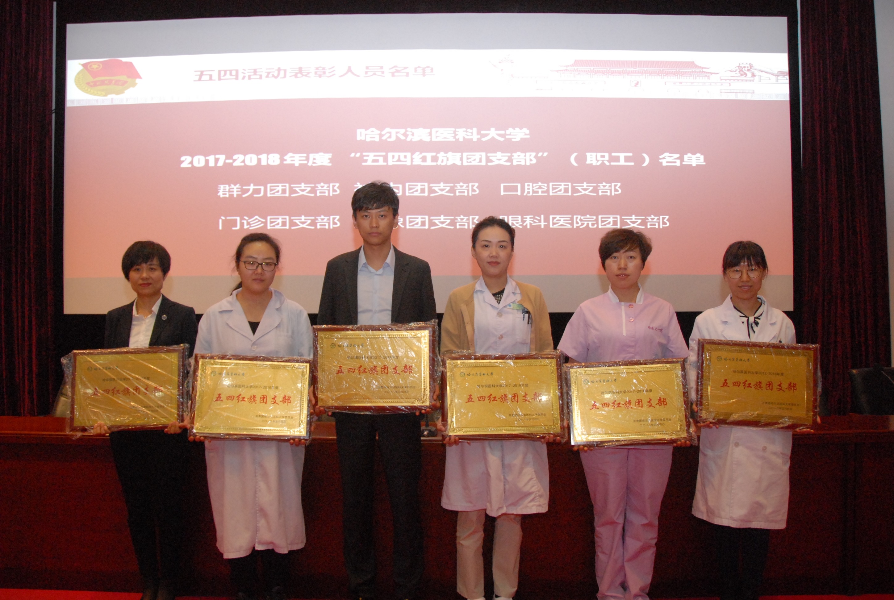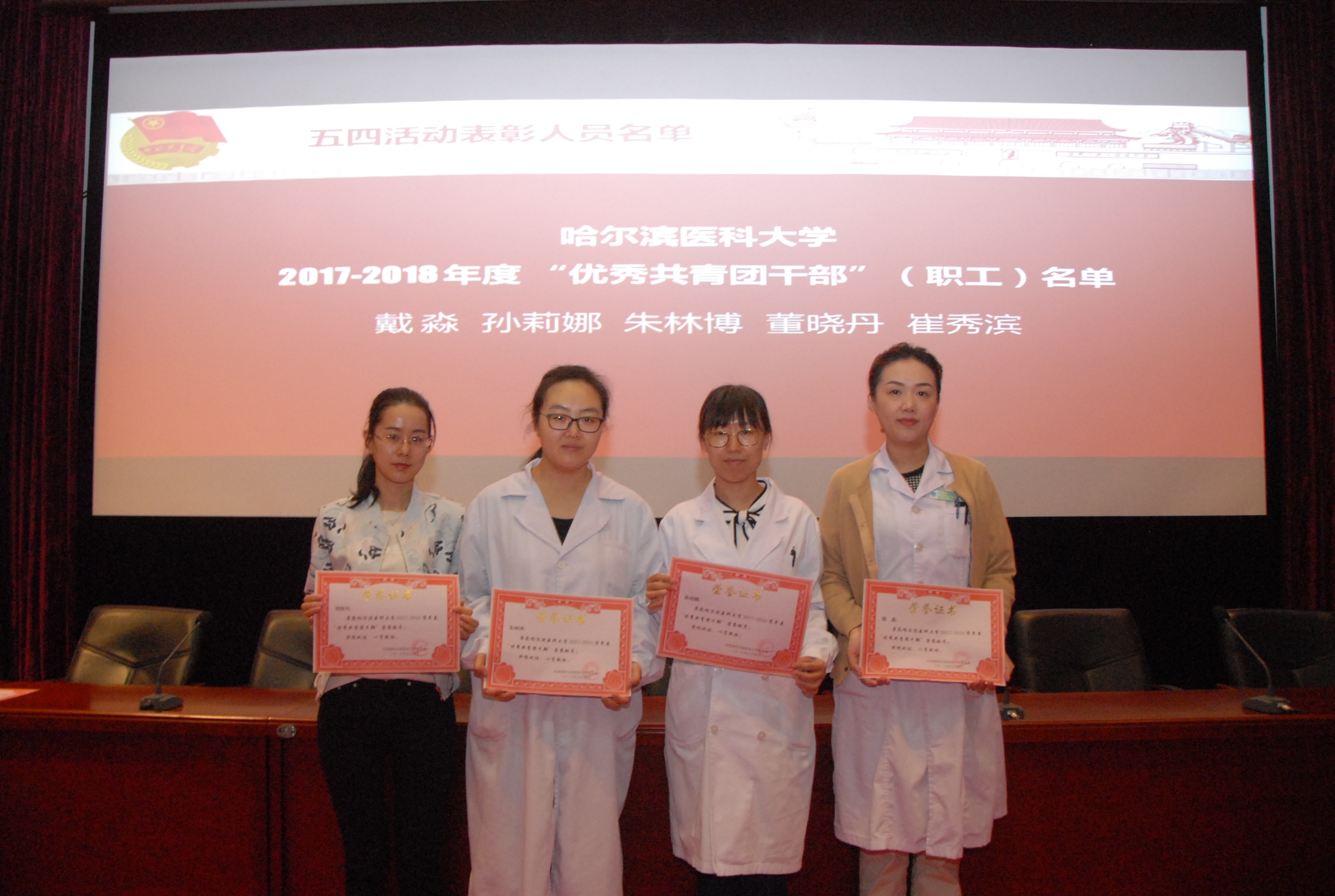 2018年5月4日,共青团哈尔滨医科大学委员会公布了《关于表彰哈尔滨医科大学2017-2018年度“五四红旗团委”、“五四红旗团支部”、“优秀共青团员”、 “优秀共青团干部” 的决定 》(哈医团发〔2018〕4号),我院曹悦同志获“哈尔滨医科大学优秀共青团员”荣誉称号,朱林博同志获“哈尔滨医科大学优秀共青团干部”荣誉称号,口腔医学院团支部获“哈尔滨医科大学五四红旗团支部”。