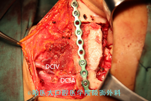 接受手术的是一名42岁的女性患者,因“右下颌骨肿物”(术后病理回报均为“牙源性角化囊性瘤”)先后于本市不同医院就诊并先后接受开窗及刮除手术,术后均出现复发。为求治愈,前来我院就诊。入院后,吴衍昌教授团队进行了详细病情分析,手术设计,在充分完善术前准备并制定手术方案后,经科室主任焦晓辉教授主持口腔颌面科及相关科室专家对拟行手术方案予以充分的论证并提出了相应的修改建议。术中应用术前预制的下颌截骨导板,截断下颌骨体及升支前端,应用基于模型外科基础的预成型手术钛板维持下颌骨连续性。解剖分离DCIA至髂外动脉起始部,游离其全程,期间解剖保护圆韧带,髂股沟神经及股外侧皮神经等重要结构,保留髂前上棘,以维持愈后髂部形态,截取5cm×1.8cm髂骨骨瓣,显微外科吻合颌外动脉-DCIA,DCIV-下颌后静脉后,就位骨瓣精确修复下颌骨骨缺损。术程顺利,患者安返病房。
